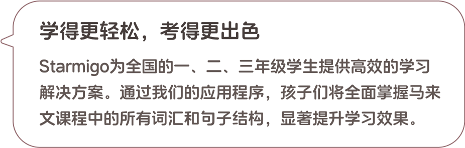 准备好让您的孩子轻松掌握马来文了吗?立即下载Starmigo,体验我们独特的学习方法,助力孩子的语言成长。只需10分钟,您将看到显著的学习效果!